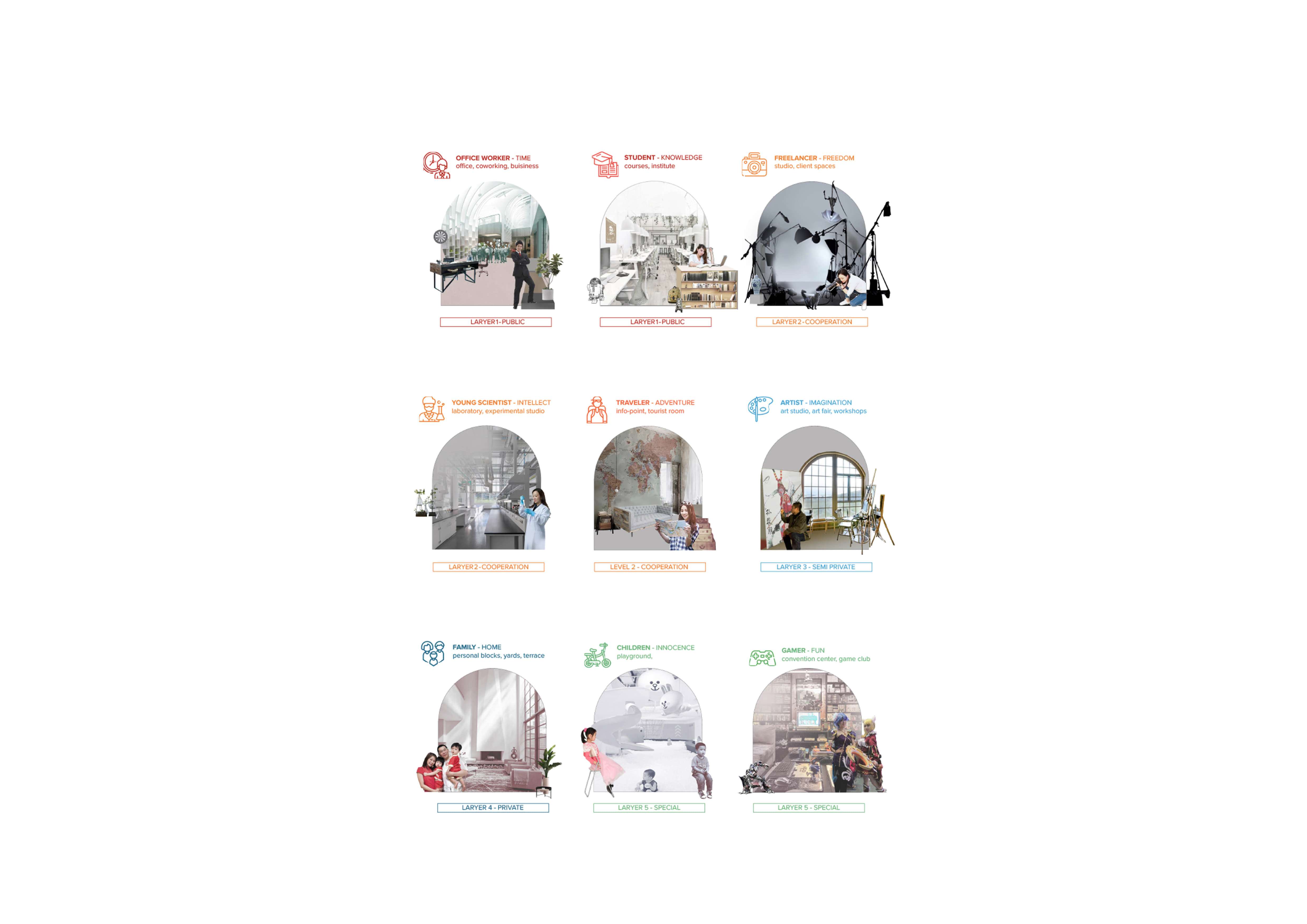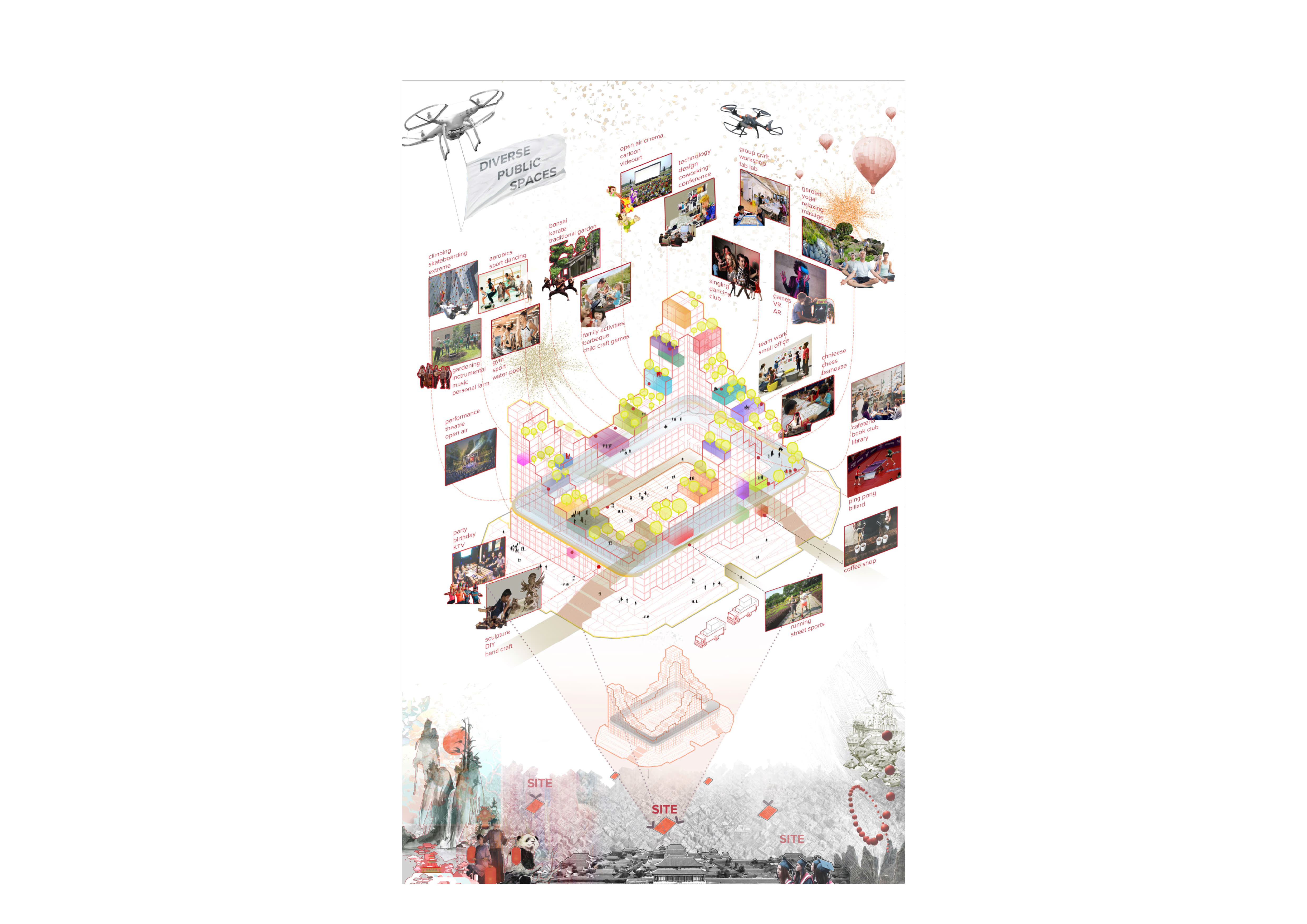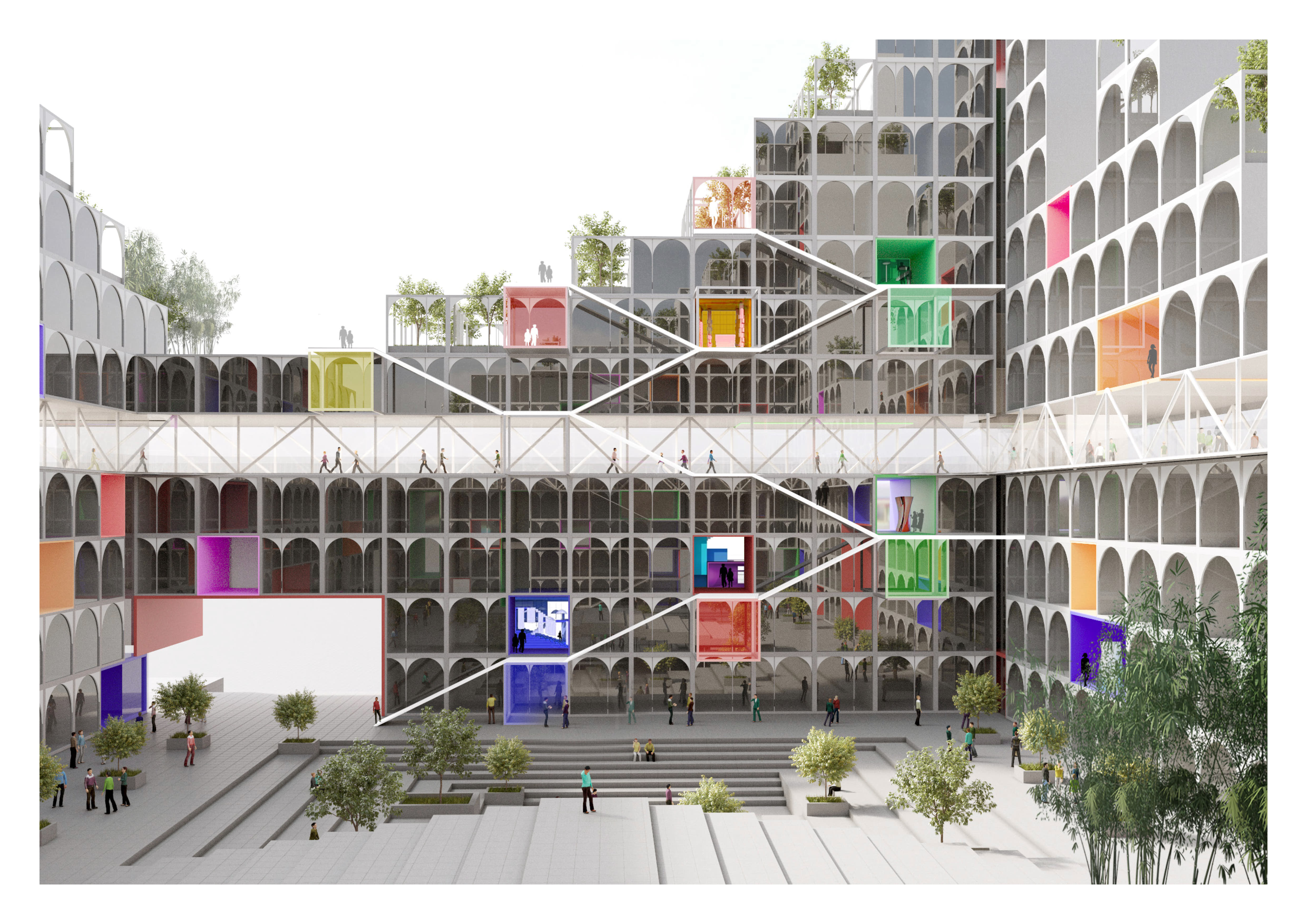 На каждом этаже расположены кухни, столовые, гостиные, спортивные и детские игровые пространства. Первые и последние этажи занимают зоны ретейла, кафе, мастерские и коворкинги.