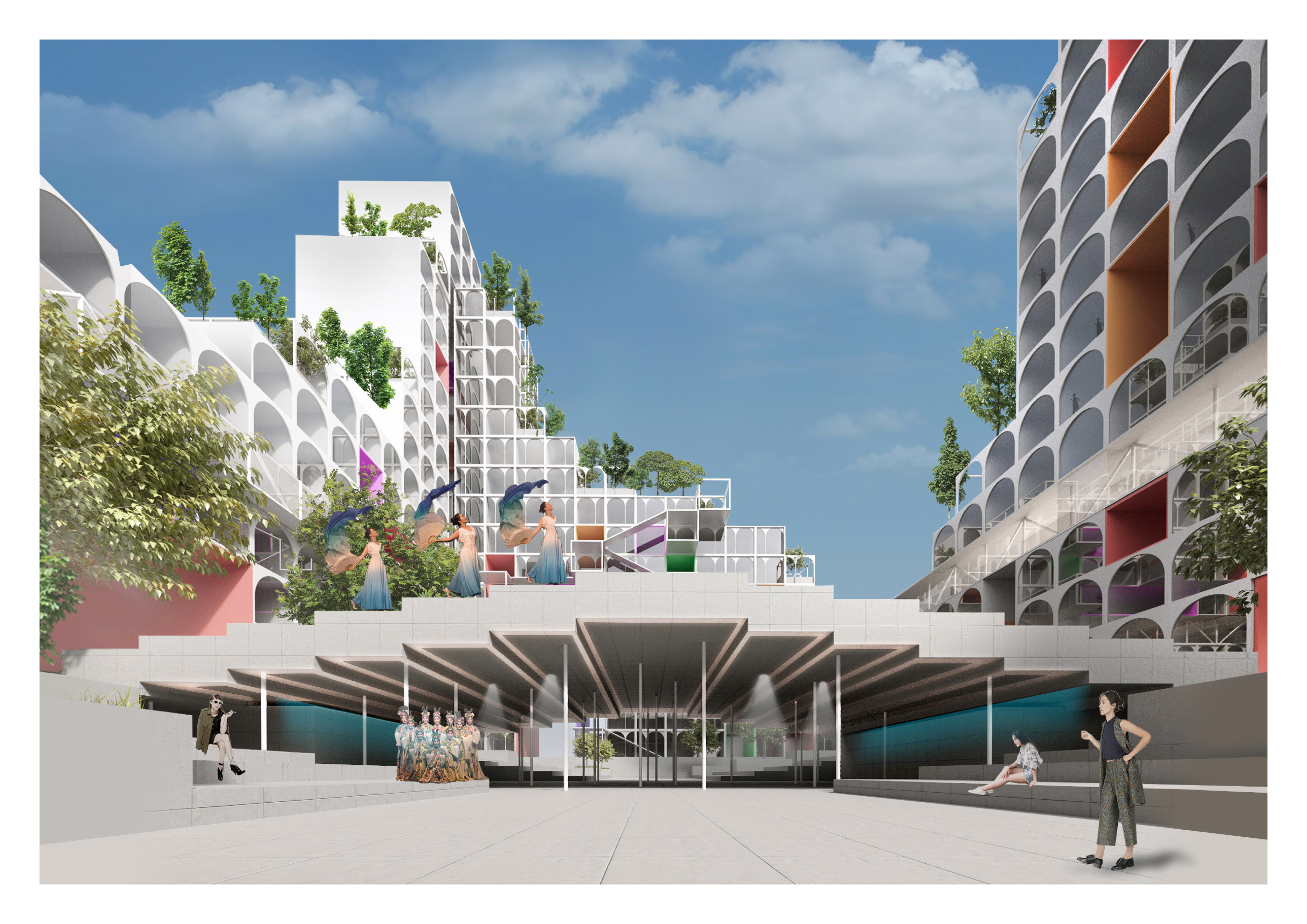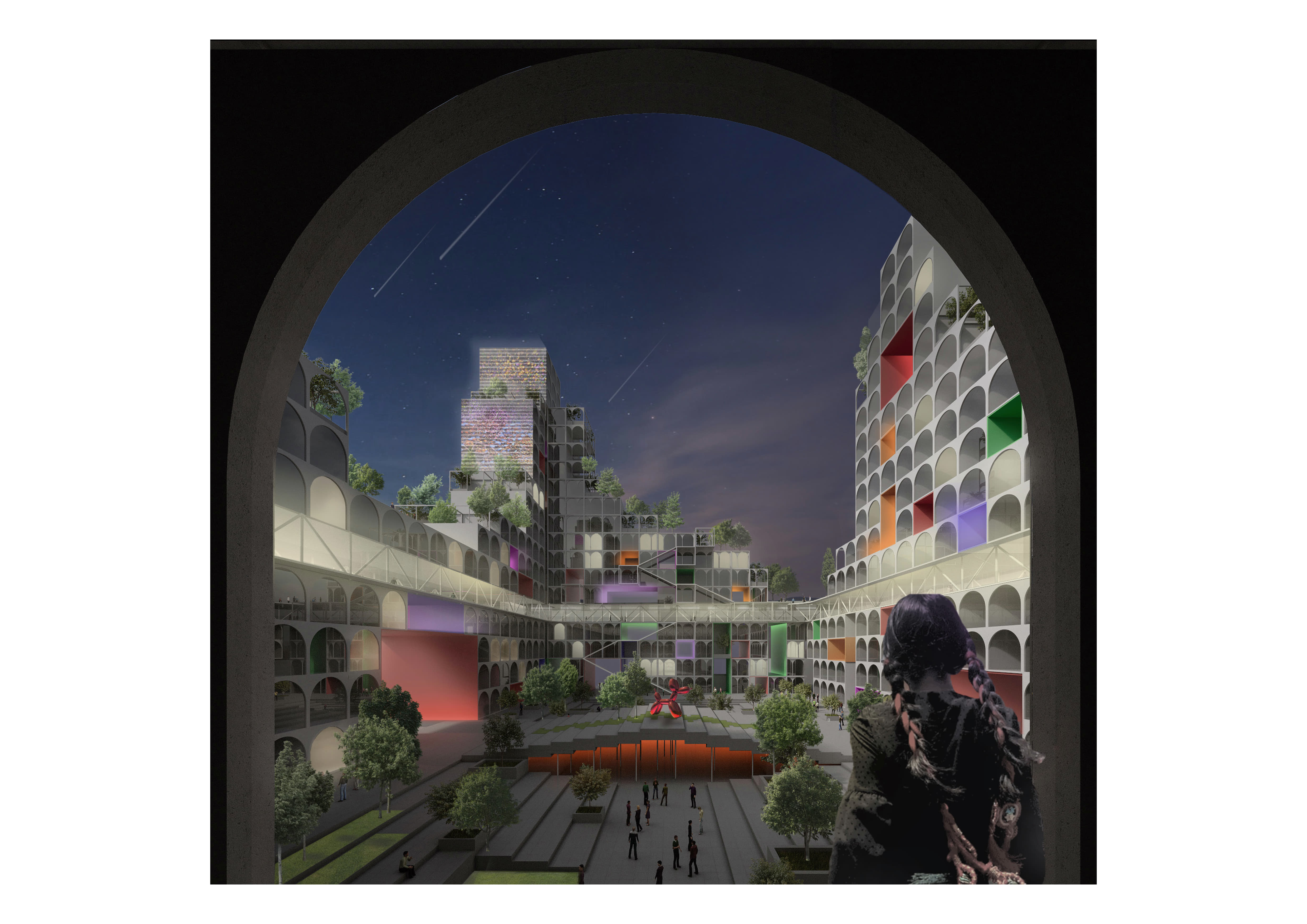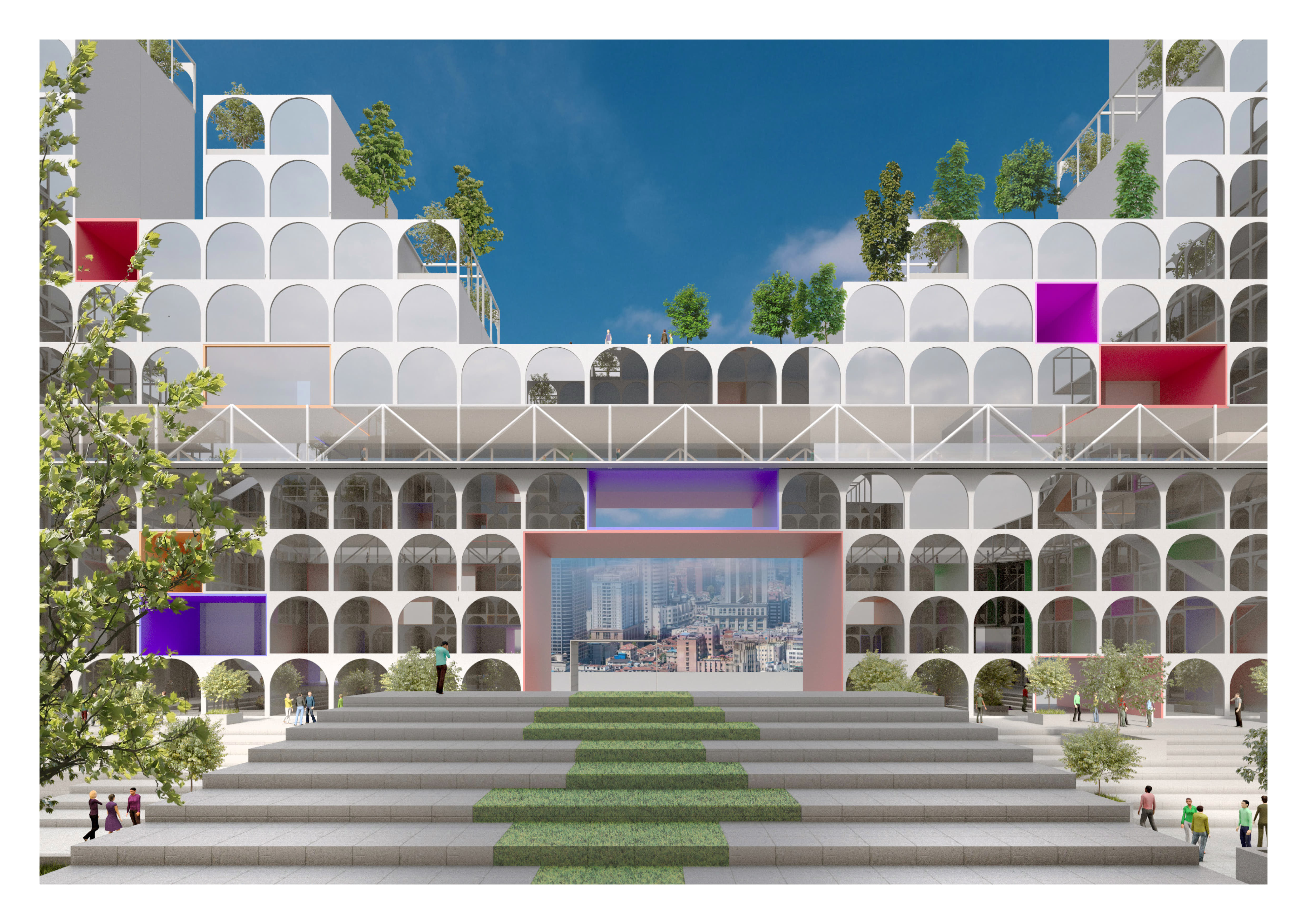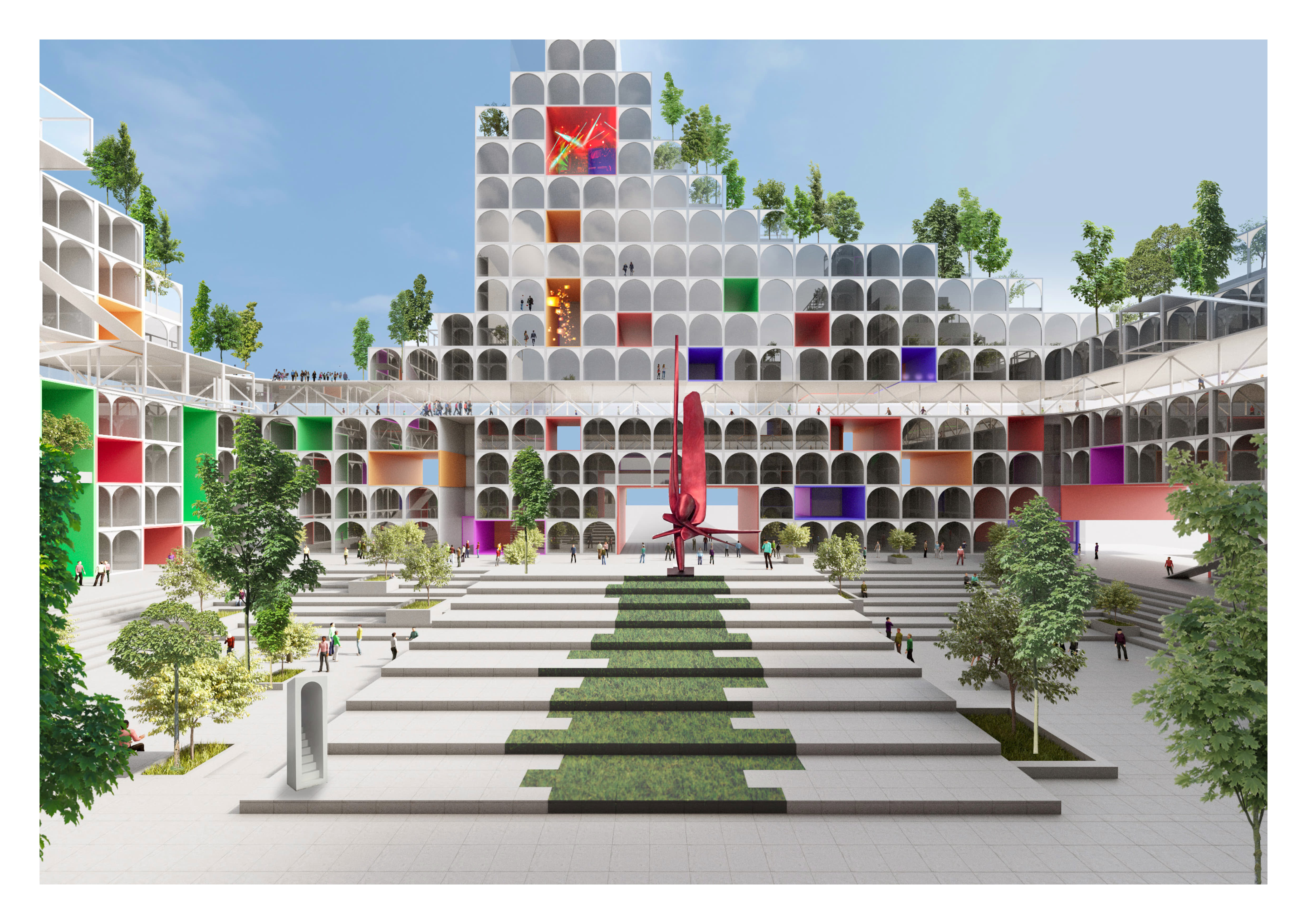 На каждом этаже расположены кухни, столовые, гостиные, спортивные и детские игровые пространства. Первые и последние этажи занимают зоны ретейла, кафе, мастерские и коворкинги.
