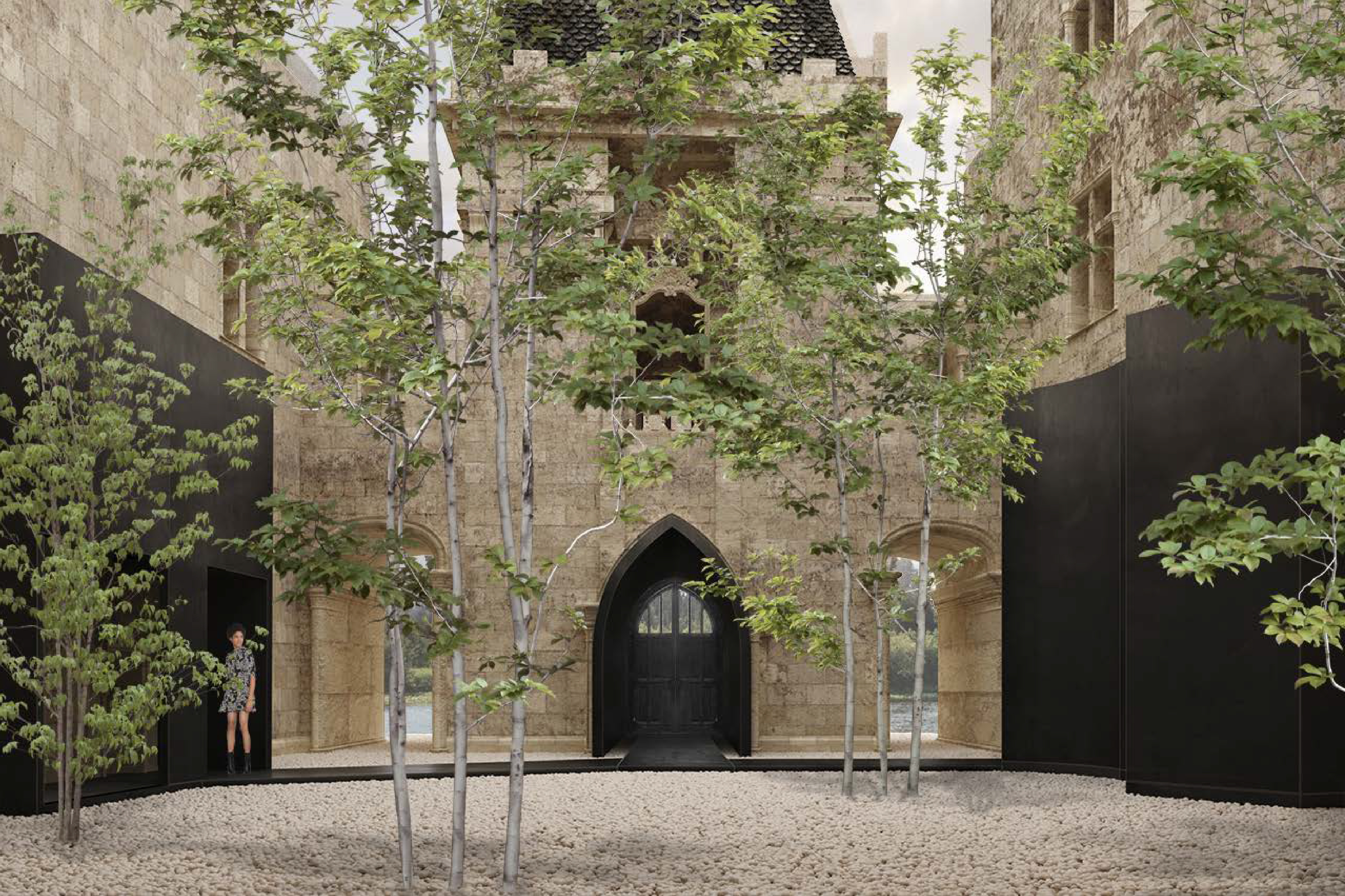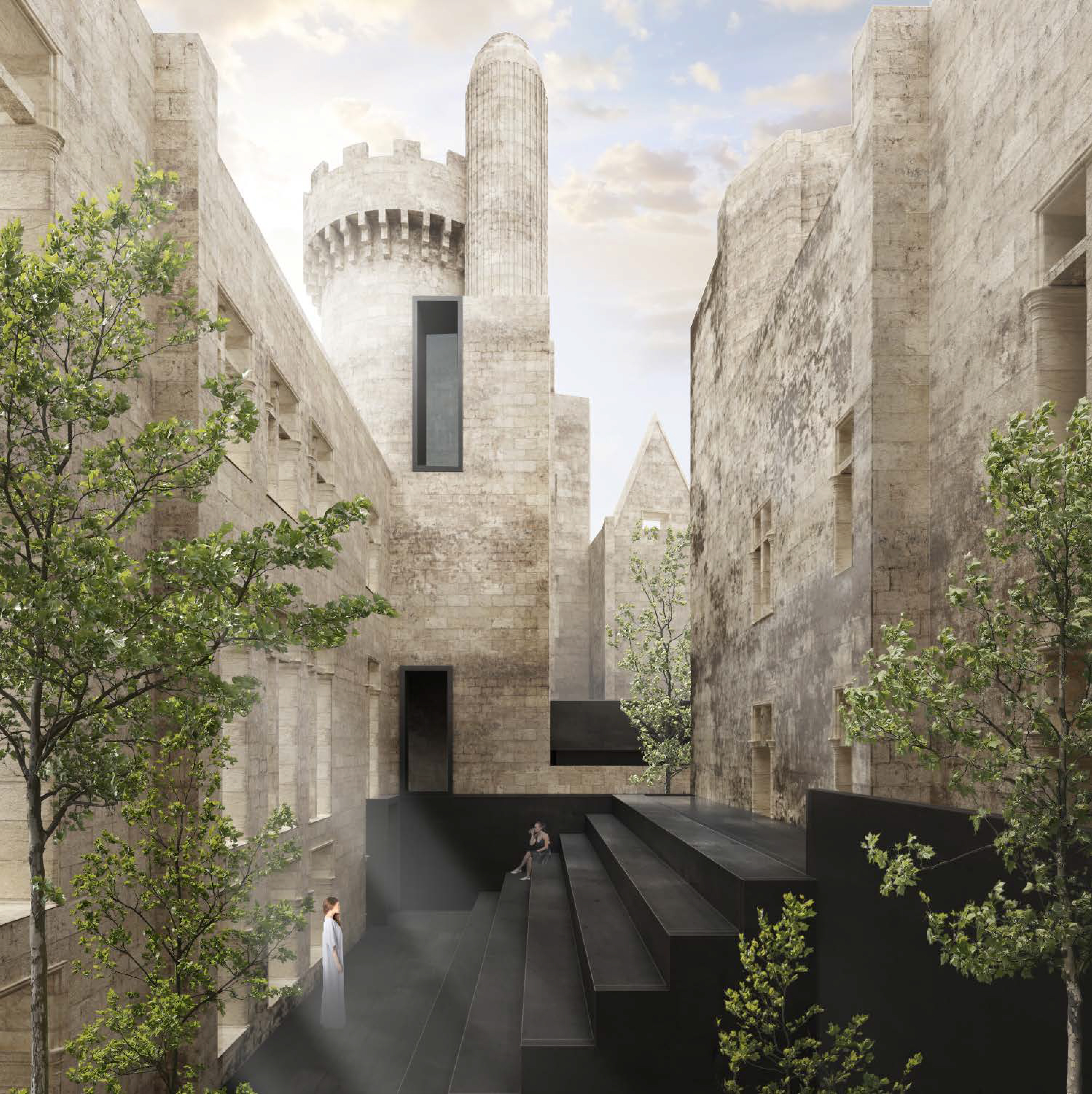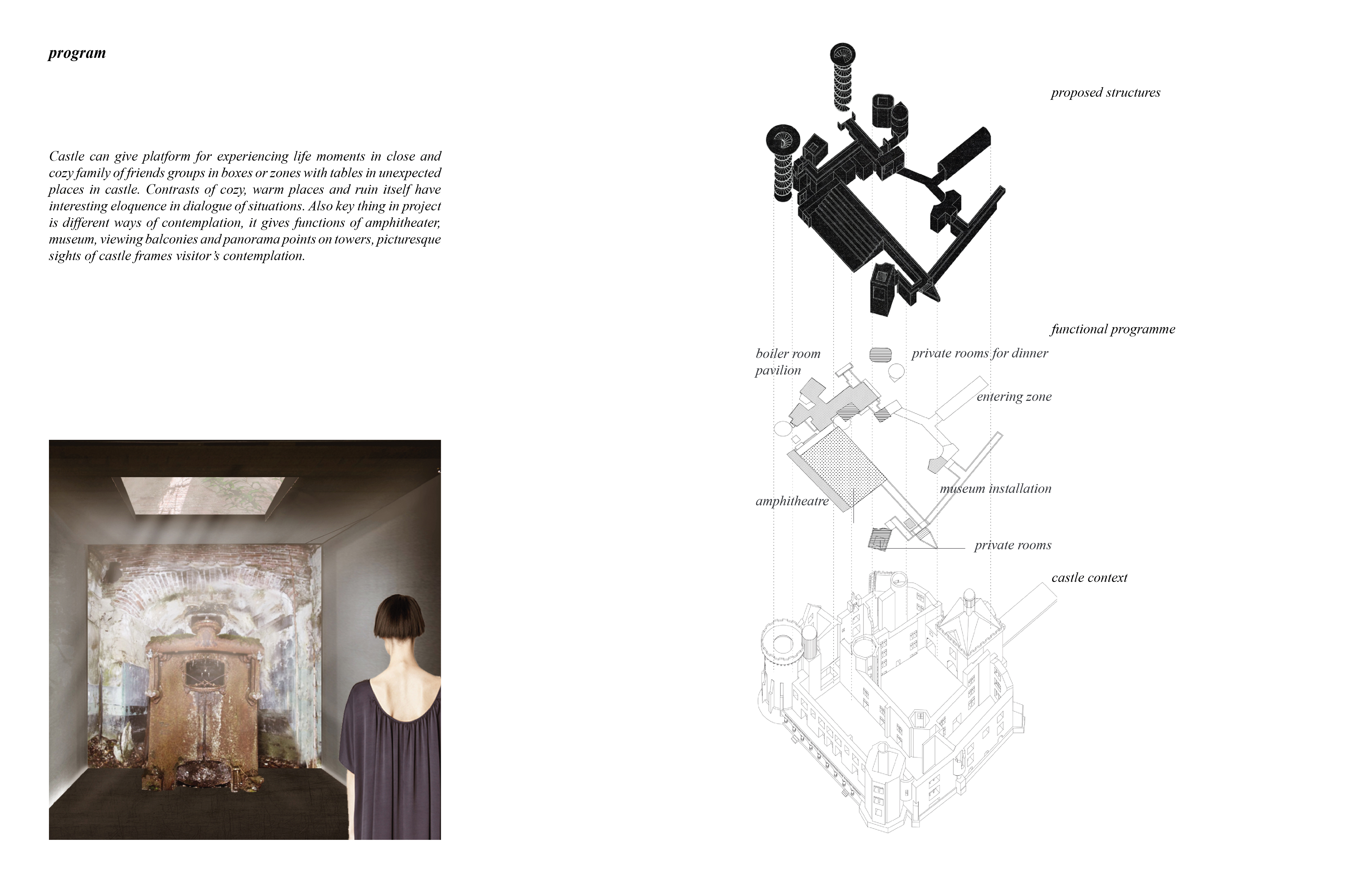 Проект предусматривал сохранение замка в его текущем состоянии, создание ивент-площадки внутри его стен и небольшой зоны глэмпинга на прилегающей территории для размещения гостей мероприятий. Архитектурная концепция строилась на контрасте фактуры каменных стен замка и черного цвета привносимых функциональных элементов. Проект консорциума завоевал золото конкурса.