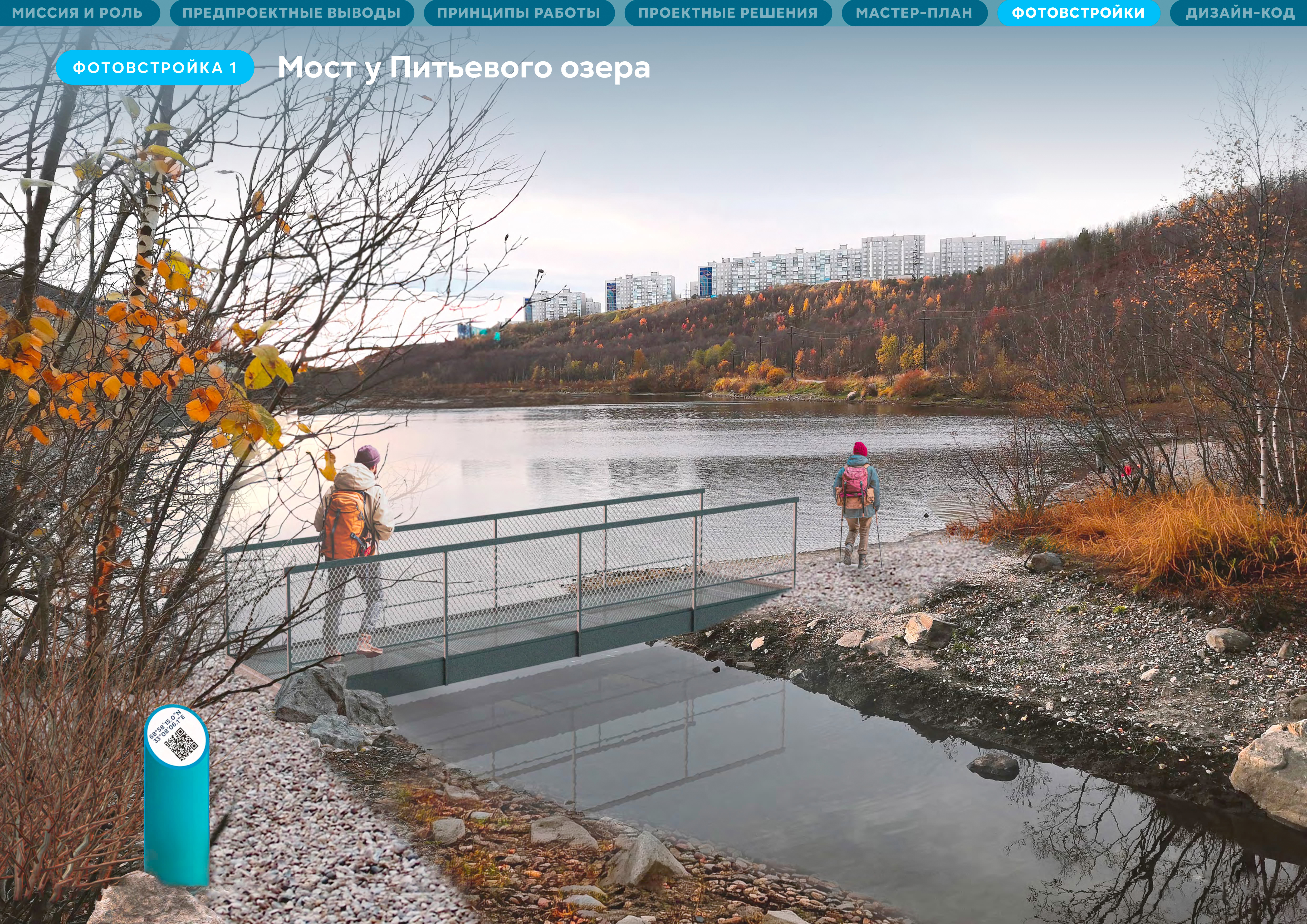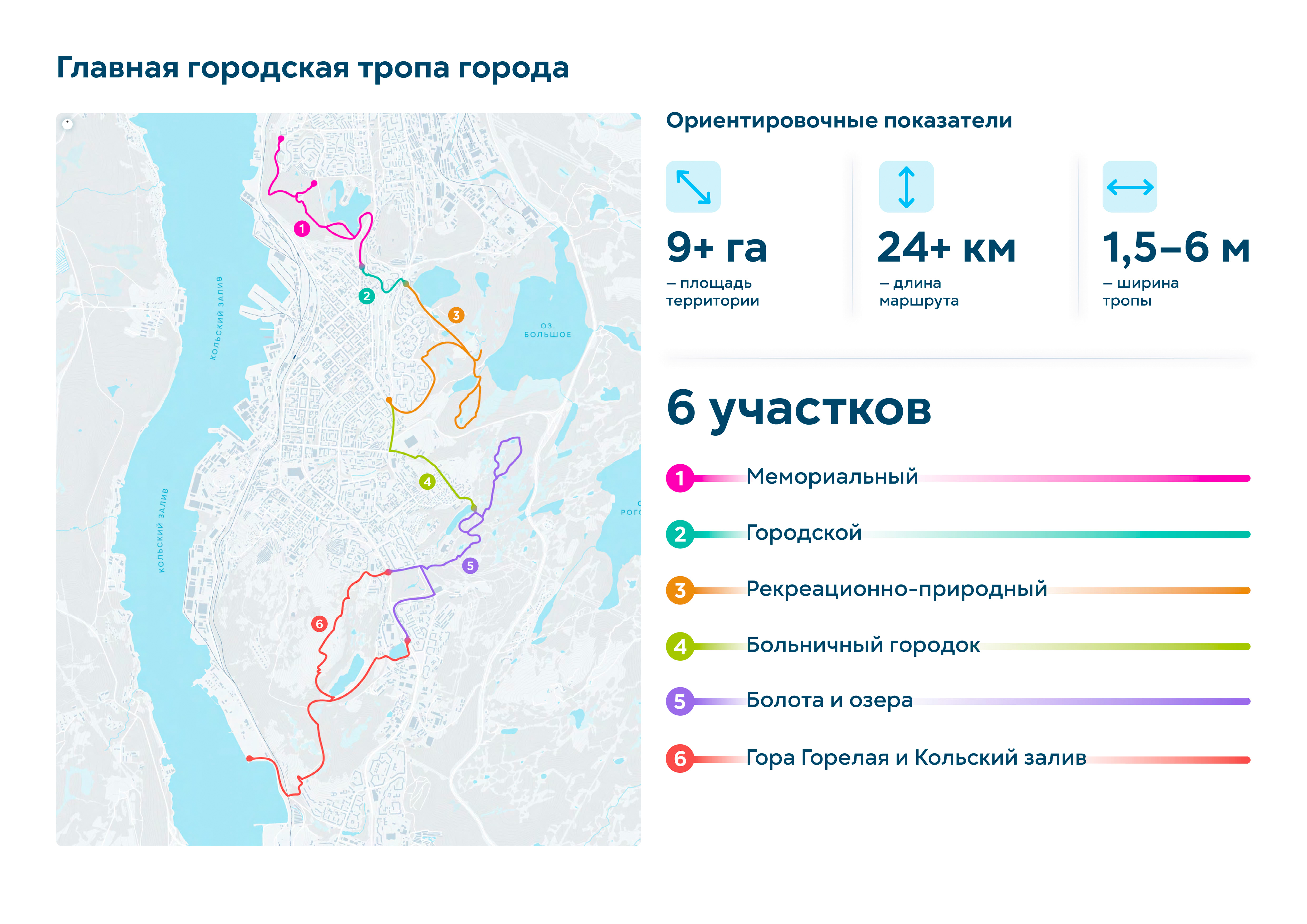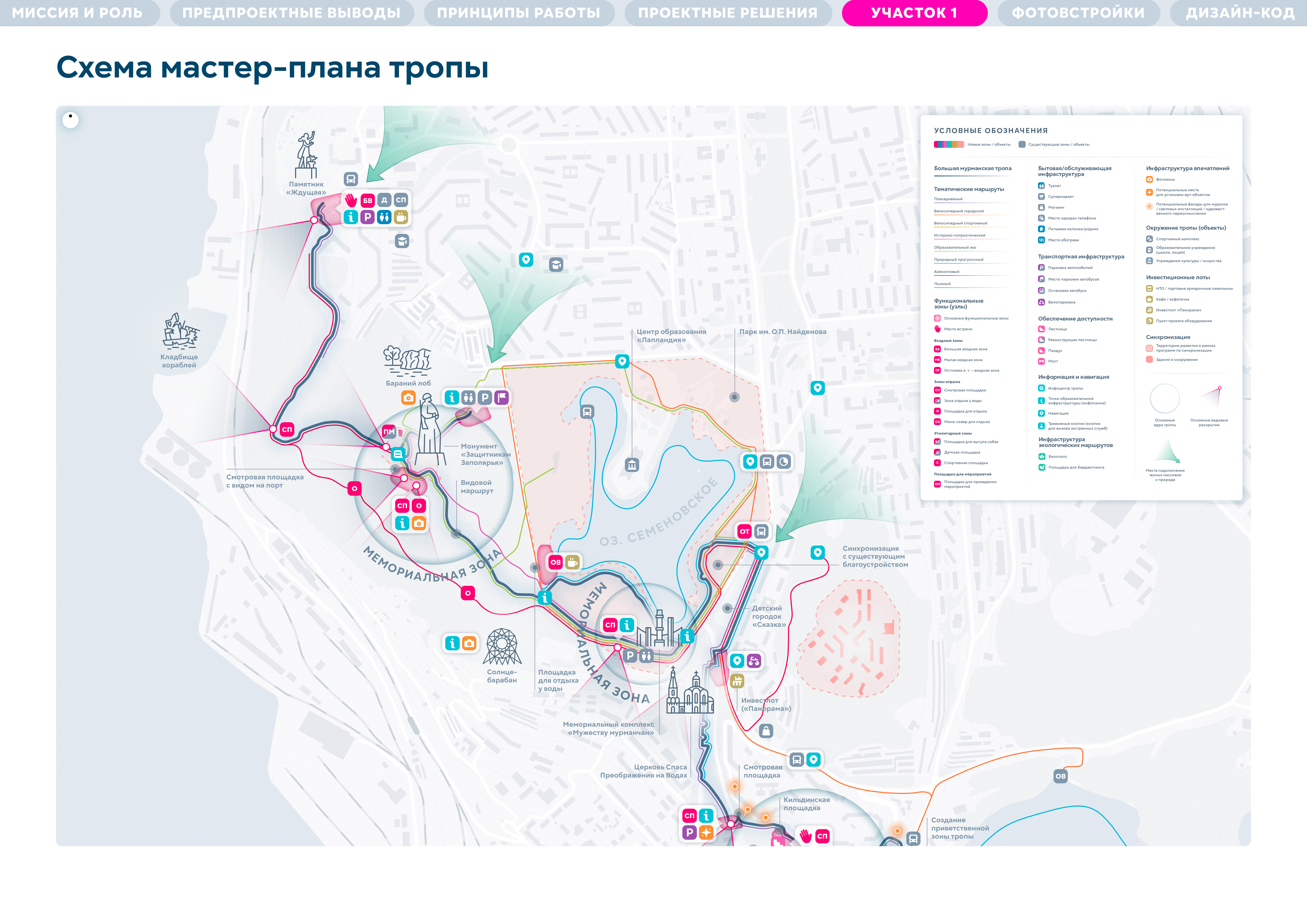 Идея тропы появилась на этапе разработки мастер-плана как ответ на отсутствие набережной в городе. Тропа, которая свяжет набережные семи озер, создаст систему видовых раскрытий на большую воду — на залив,станет альтернативной набережной. Мурманск — активно развивающийся город. При работе было важно учесть и синхронизировать все существующие программы и низовые инициативы,которые уже развиваются здесь. Идеология и целеполагание тропы сформированы на основе стратегии «На Севере жить». Но не просто жить, а жить здоровым, спортивным, со знанием и любовью к городу.