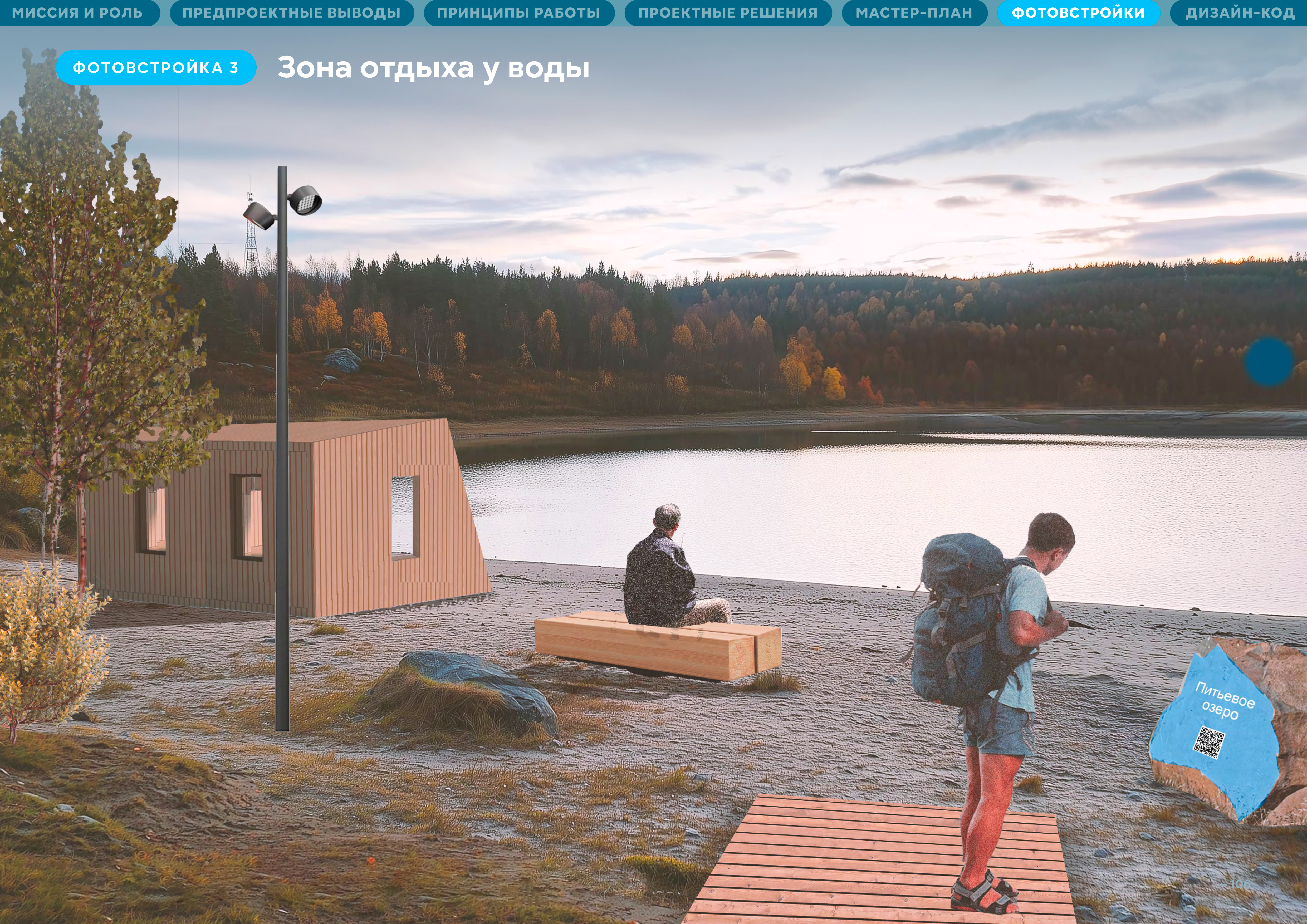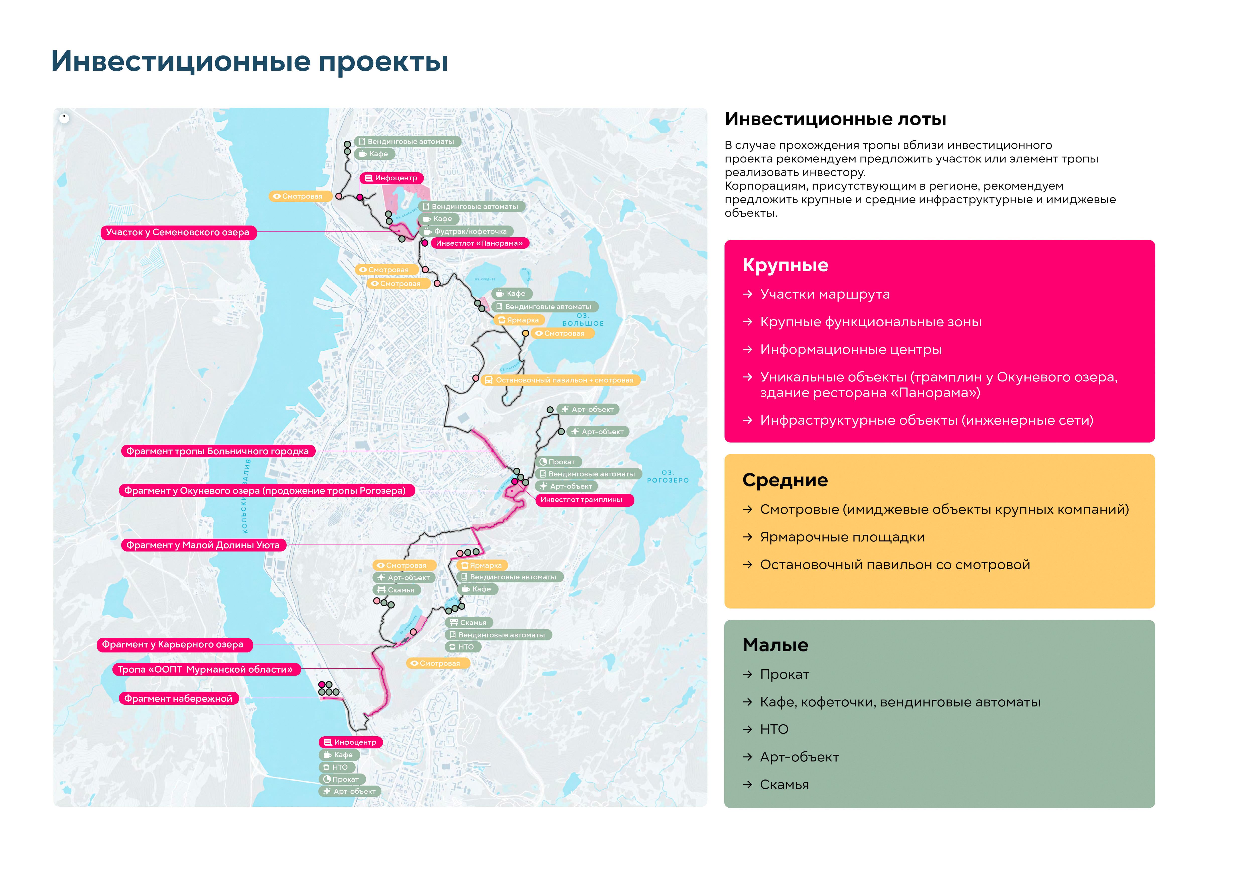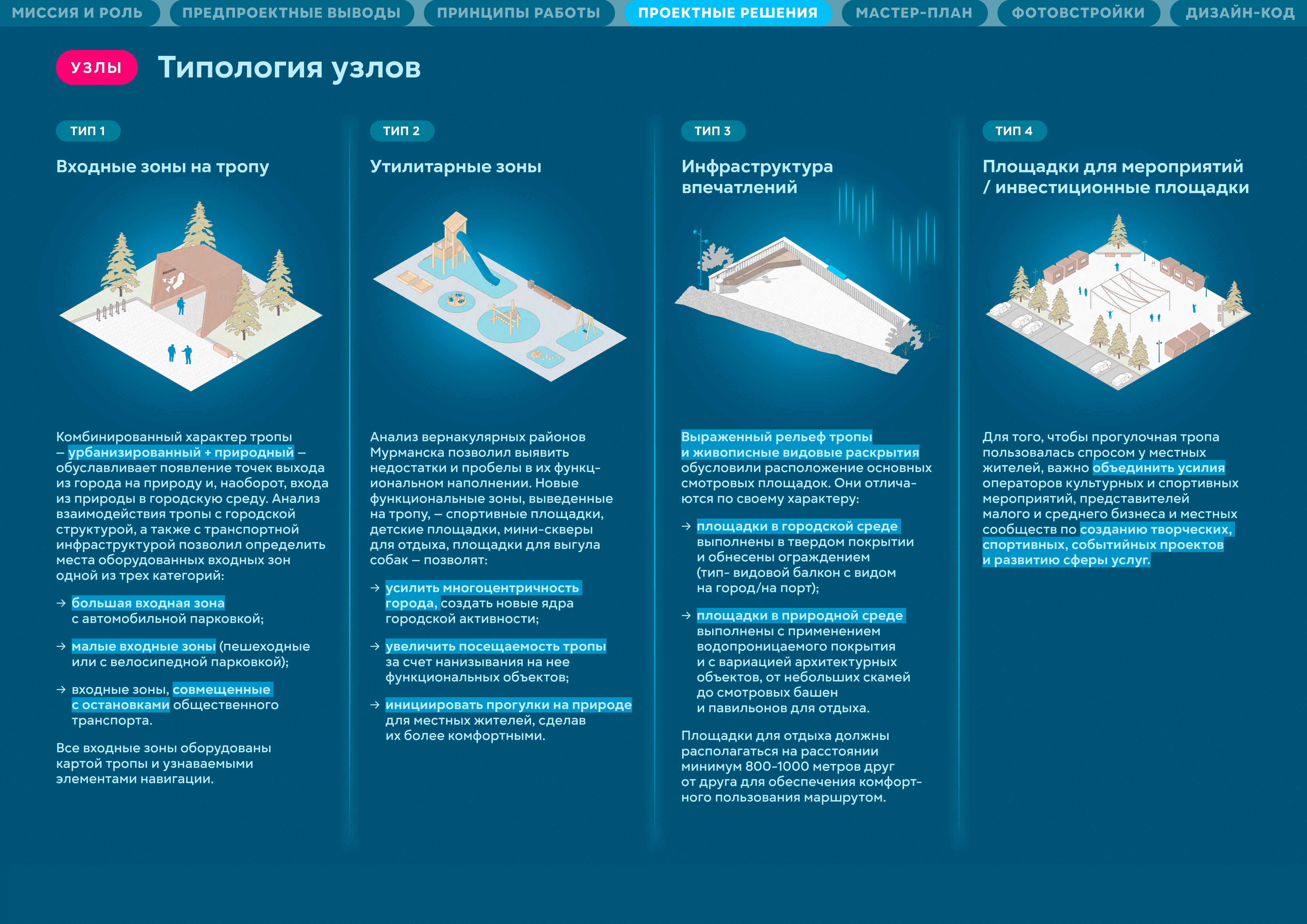 Идея тропы появилась на этапе разработки мастер-плана как ответ на отсутствие набережной в городе. Тропа, которая свяжет набережные семи озер, создаст систему видовых раскрытий на большую воду — на залив,станет альтернативной набережной. Мурманск — активно развивающийся город. При работе было важно учесть и синхронизировать все существующие программы и низовые инициативы,которые уже развиваются здесь. Идеология и целеполагание тропы сформированы на основе стратегии «На Севере жить». Но не просто жить, а жить здоровым, спортивным, со знанием и любовью к городу.