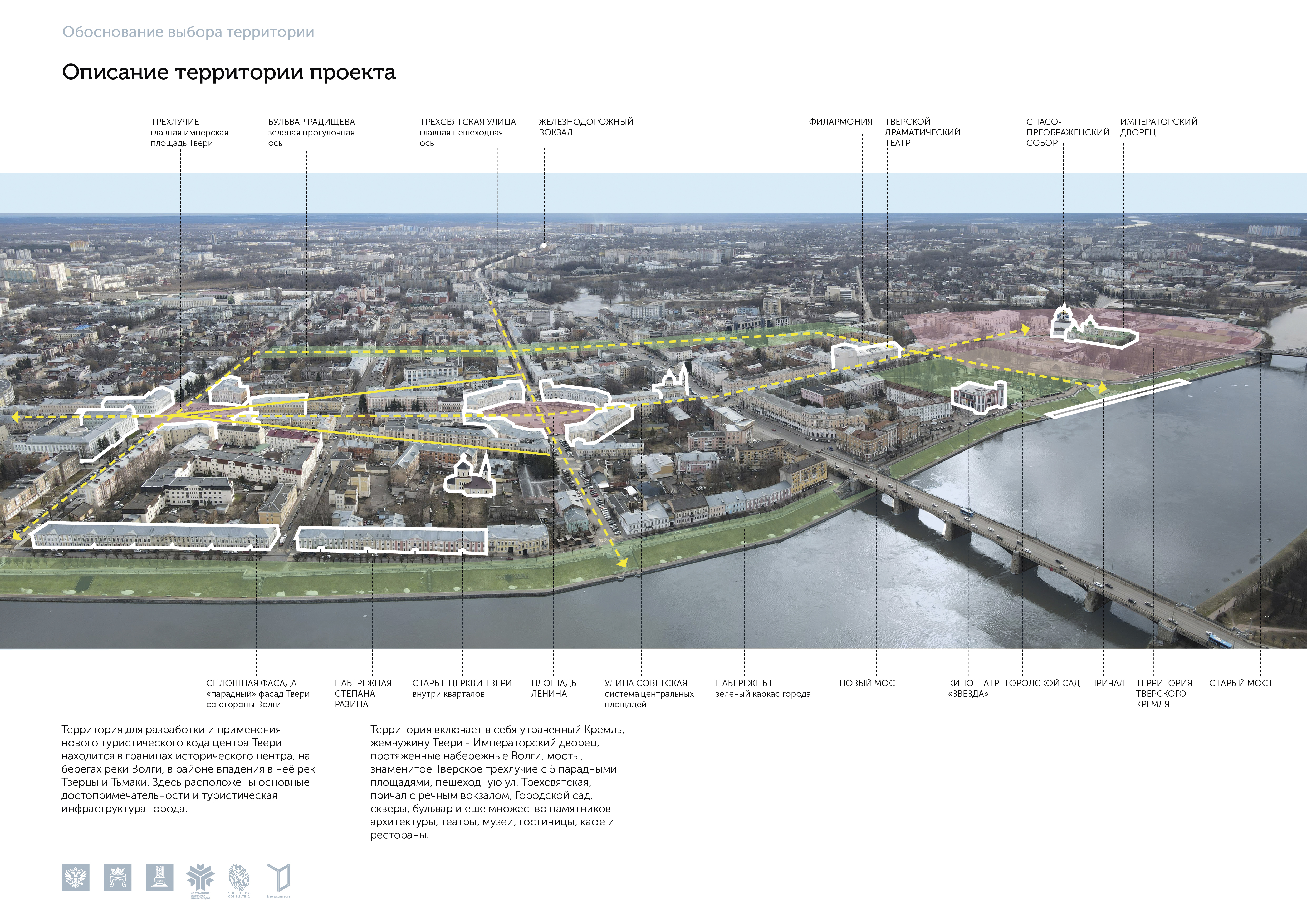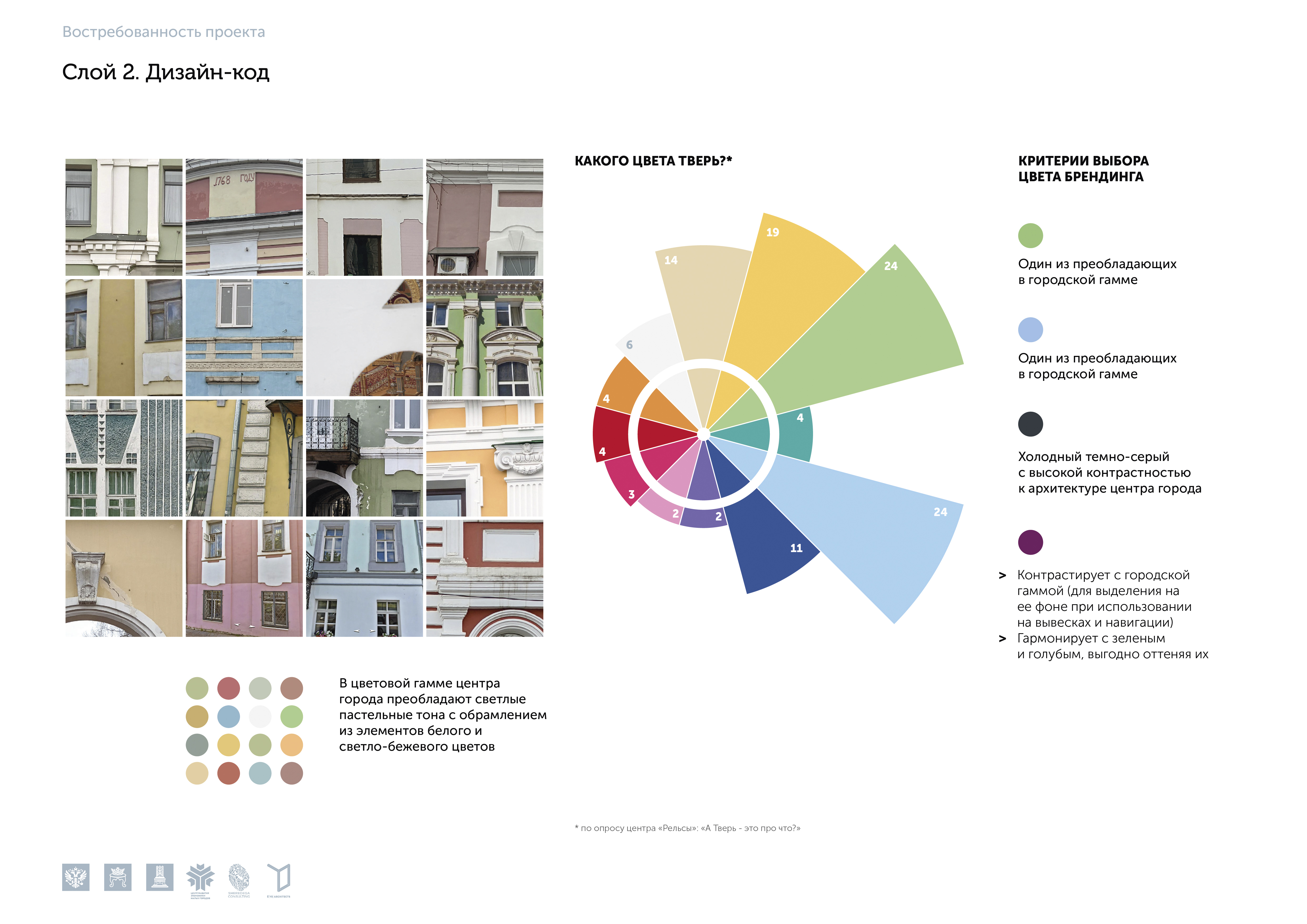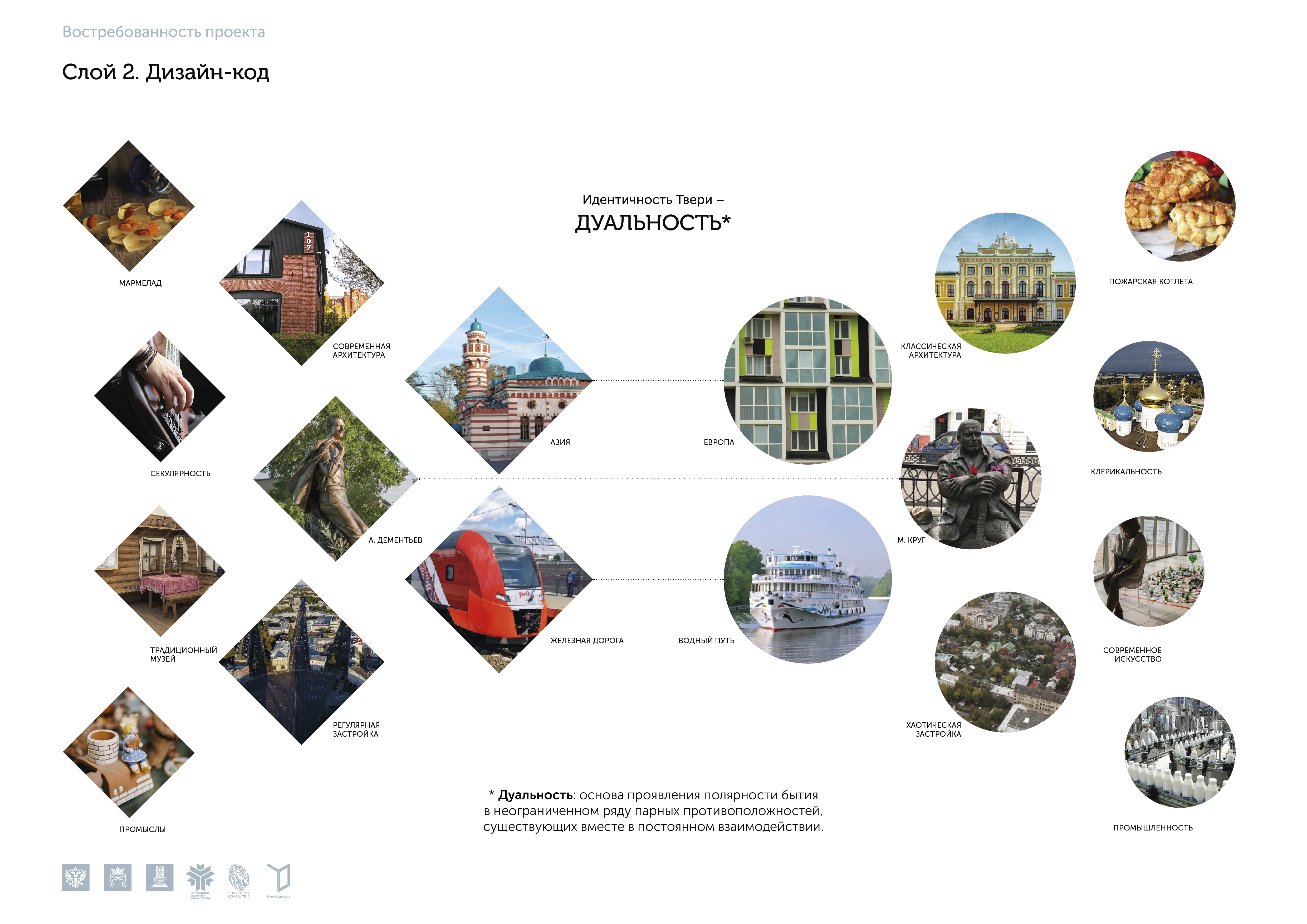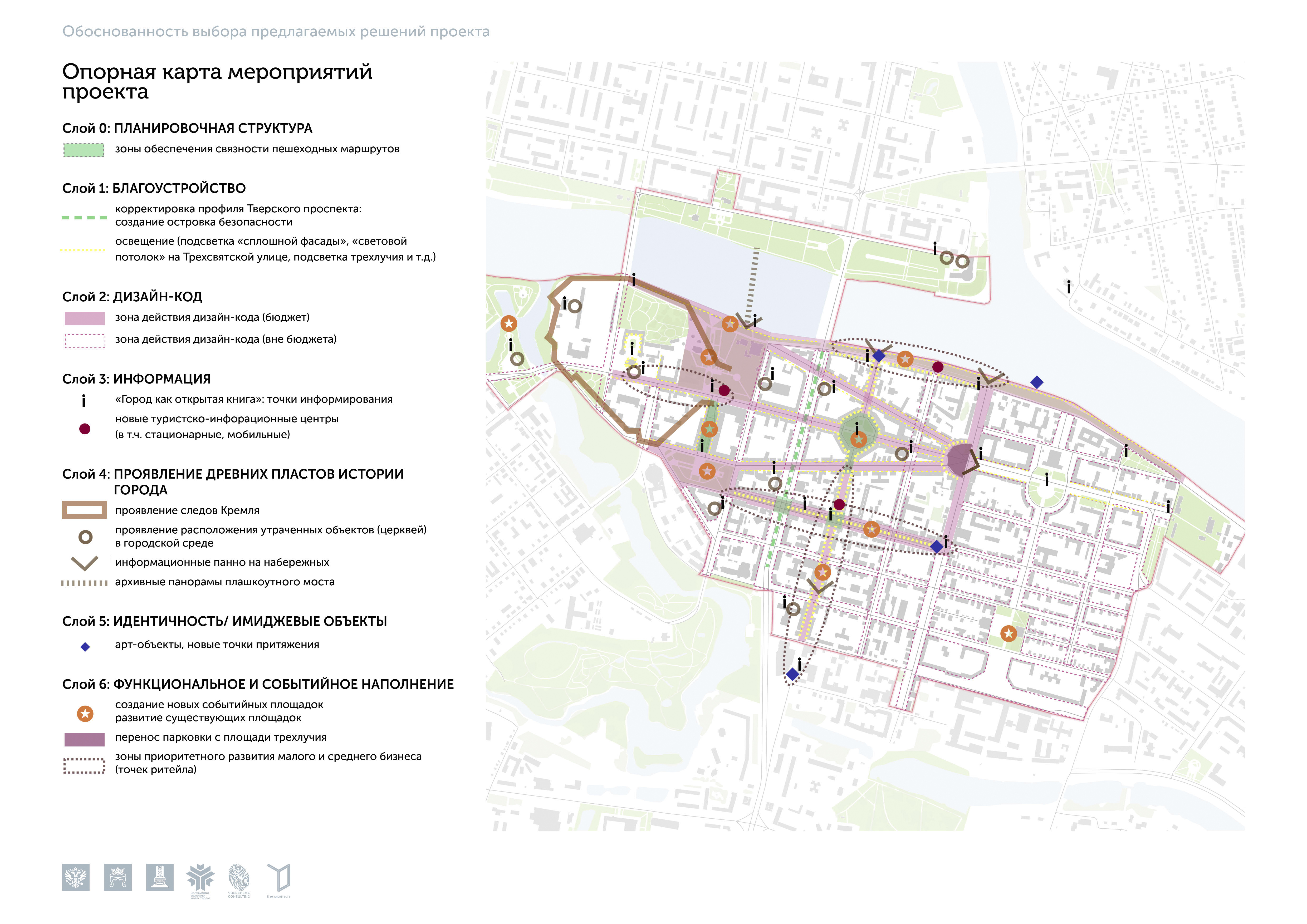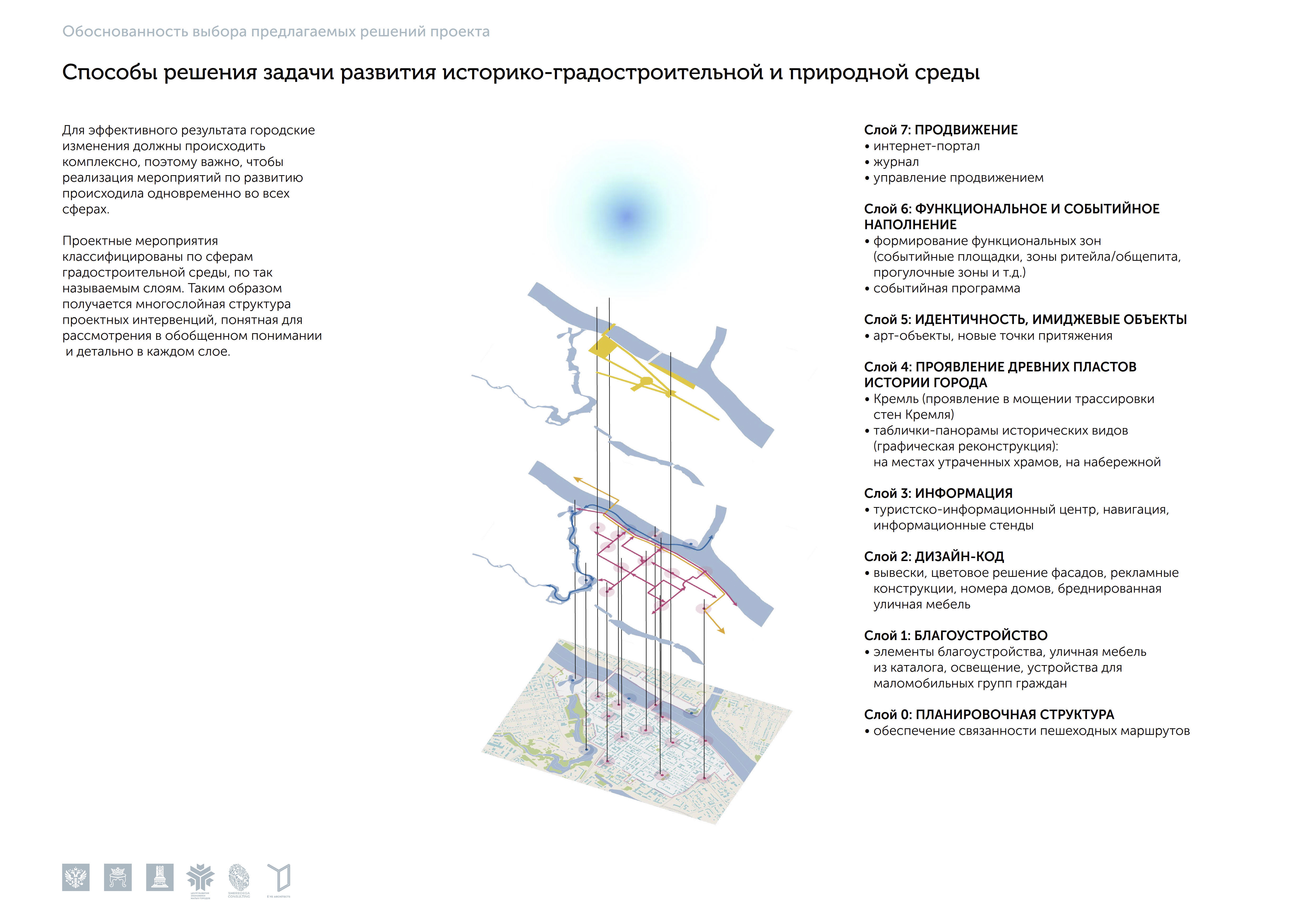 Проектные решения туристического кода Твери были распределены по восьми основным «слоям» проектных интервенций: планировочная структура;благоустройство; дизайн-код; информация и навигация; проявление древних пластов истории города; идентичность, имиджевые объекты; функциональное и событийное наполнение; продвижение. Эта методология «послойной» работы с проектами туристического кода легла в основу последующих проектов нашего бюро.