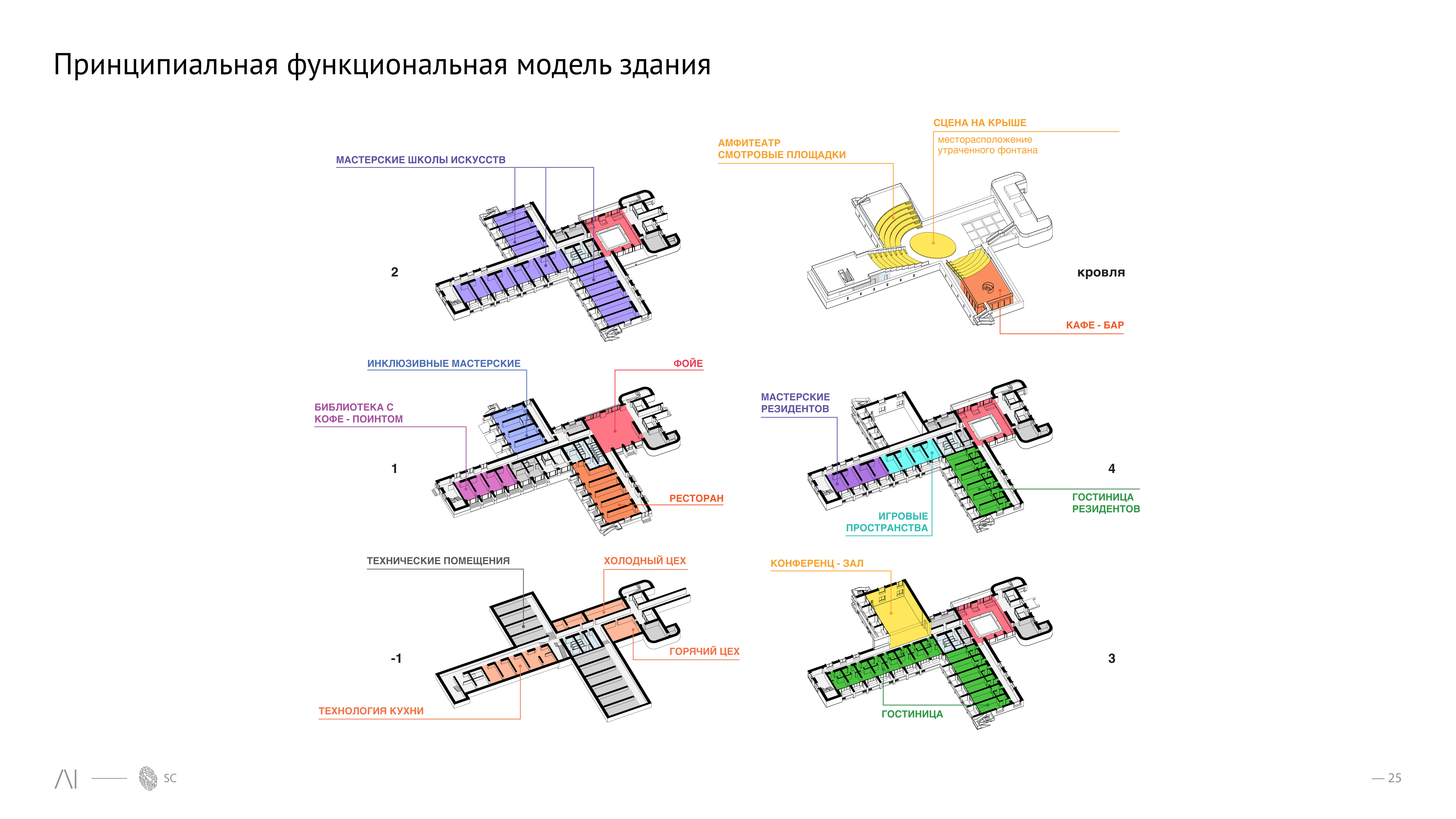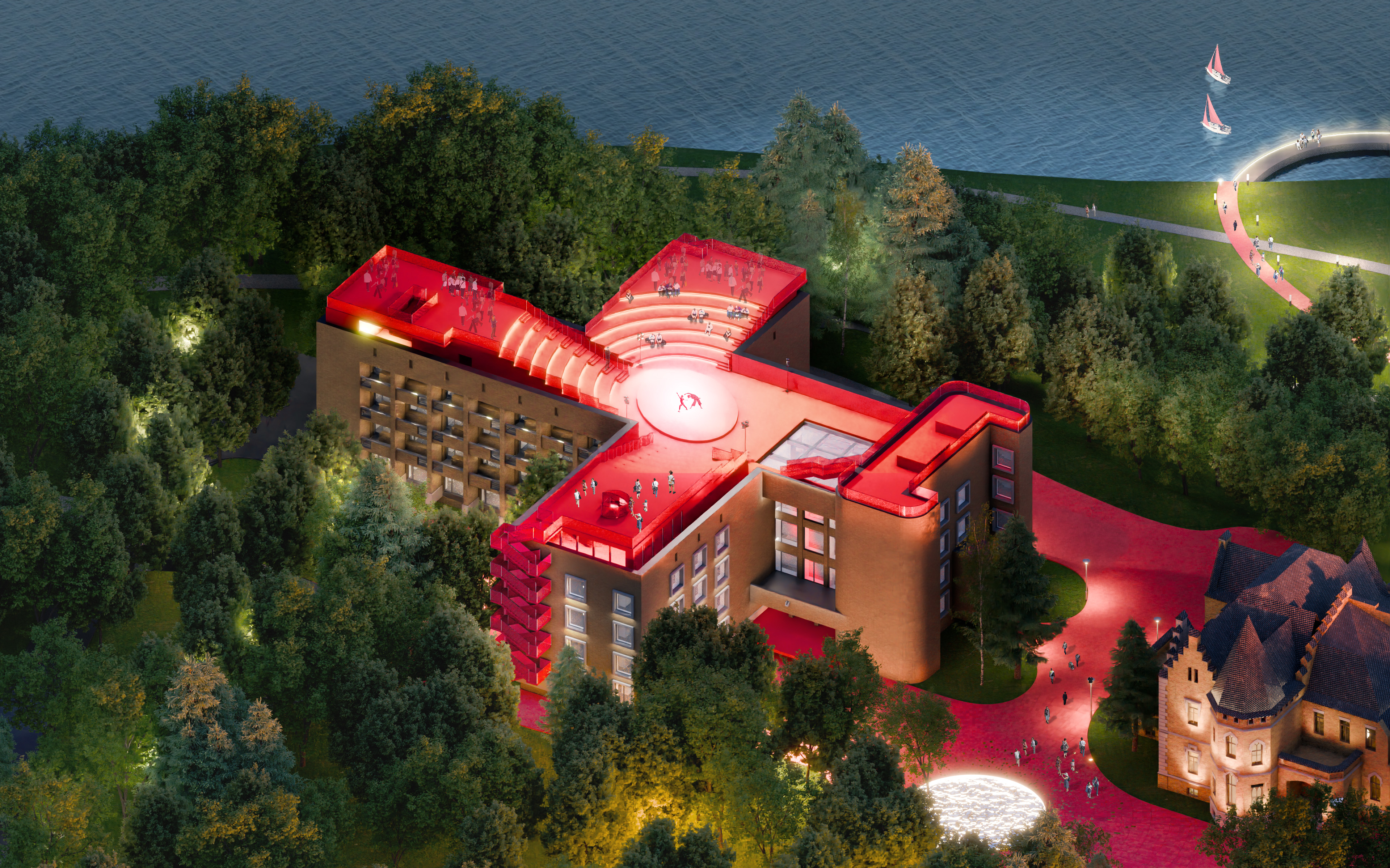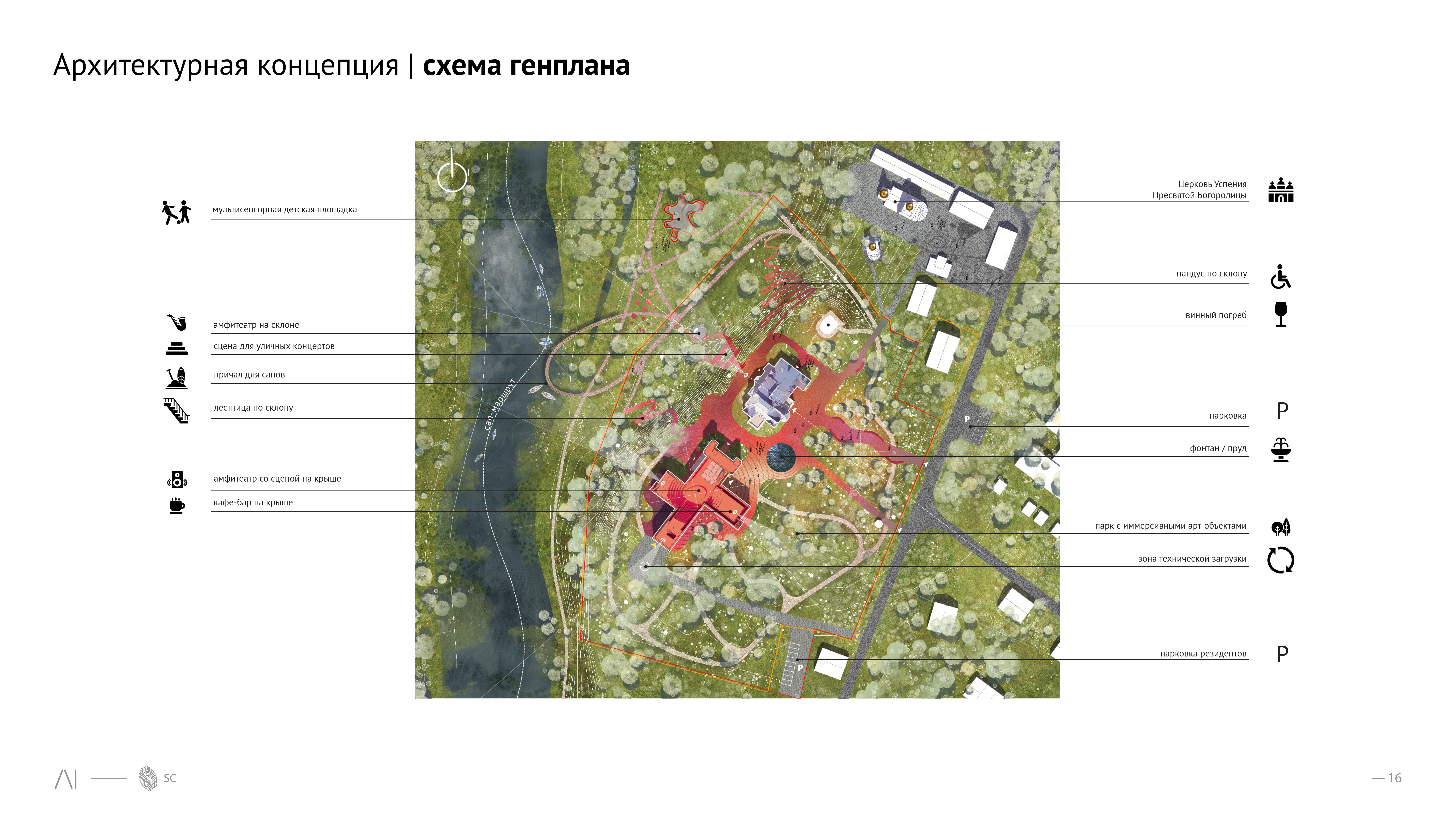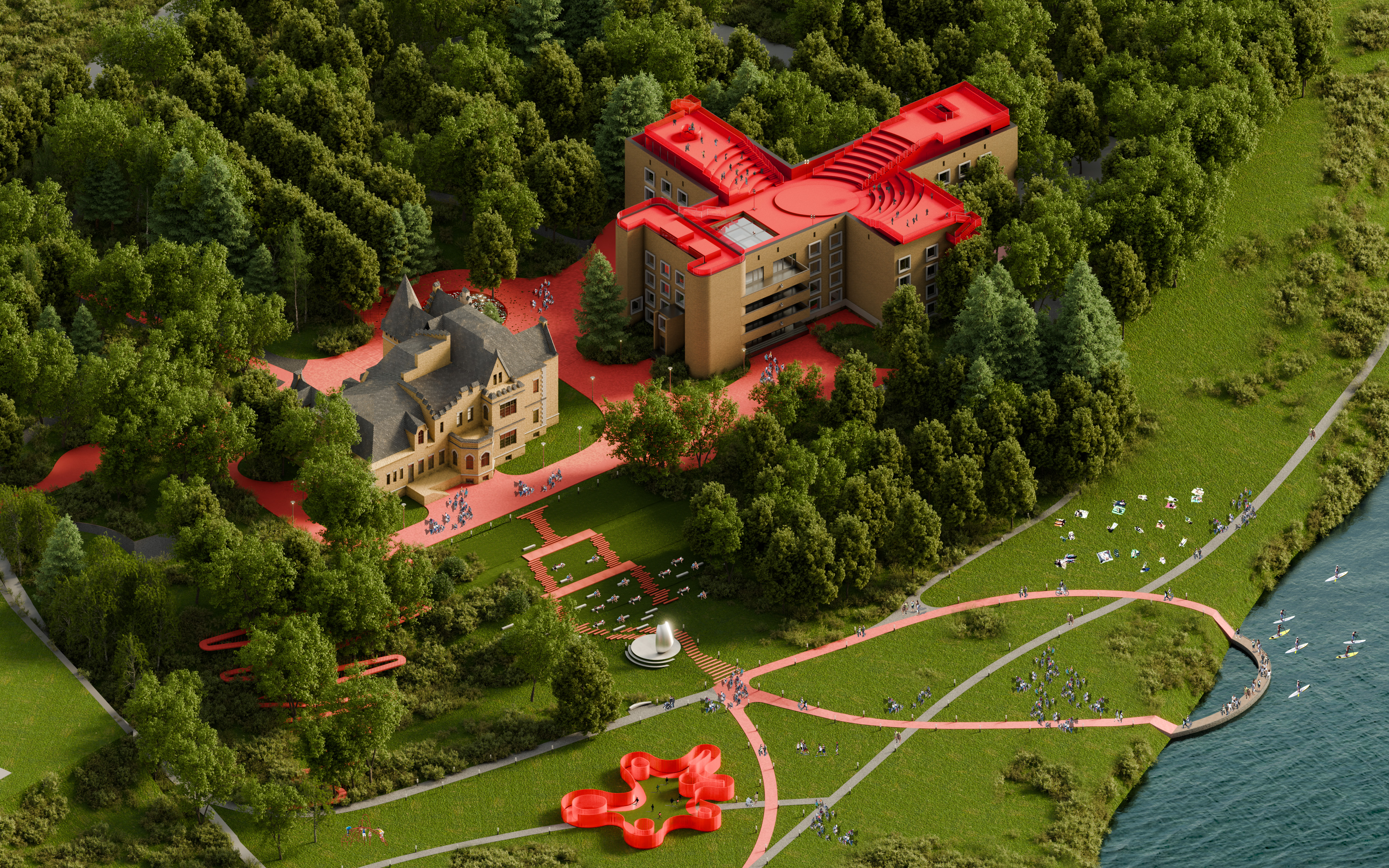 Программное наполнение состоит из четырех основных компонентов: инклюзивная школа искусств, аукционный дом, клуб для меценатов и коллекционеров и грантовая резиденция. Архитектурная концепция основана на принципах бережного сохранения, иммерсивности и интерактивности среды. Переосмысляя исторический контекст, проект создает новый культурный слой, гармонизирующий пространство усадьбы.